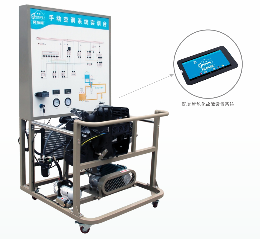 檢測(cè)控制面板,點(diǎn)火開關(guān),高壓壓力表,低壓壓力表,數(shù)字式進(jìn)風(fēng)口溫度表,數(shù)字式出風(fēng).口溫度表,空調(diào)控制器總成,空調(diào)蒸發(fā)箱總成,壓縮機(jī)總成,膨脹閥總成,干燥器總成,鼓風(fēng)機(jī)總成,冷凝器,冷卻電子風(fēng)扇,三相異步電機(jī),真空泵,智能化故障設(shè)置和考核系統(tǒng),移動(dòng)臺(tái)架(帶自鎖腳輪裝置)
