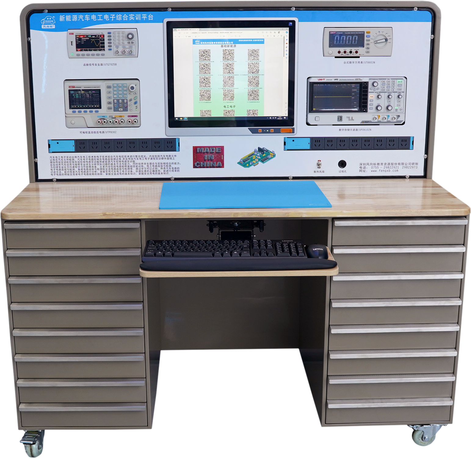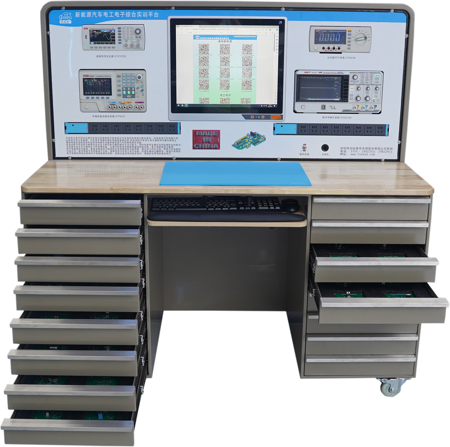 2.并在傳統(tǒng)汽車電工電子課程實訓硬件基礎上增加傳統(tǒng)發(fā)動機控制系統(tǒng)控制電路實訓板和新能源汽車控制電路實訓板如:霍爾傳感器原理實訓板、磁感應傳感器原理實訓板、光電傳感器原理實訓板、超聲波傳感器原理實訓板、充放電控制實訓板、電機控制原理實訓板、DC-DC轉換原理實訓板、IGBT驅動原理實訓板等共計90多種實訓板;實訓臺中控屏內安裝有穩(wěn)壓電源、數(shù)字示波器,萬用表,信號發(fā)生器,溫度計等測量設備,可獨立實現(xiàn)對90多種汽車電工電子實訓板的直流可調電源供給、信號仿真模擬、波形測量、電壓測量、電阻測量、電流測量、常用電子元件檢測功能,每個模塊電路板上均設計了保險絲和二級管等保護器件,防止學生因接線錯誤導致斷路損壞實驗板,保證了每個實驗板的耐久性。
